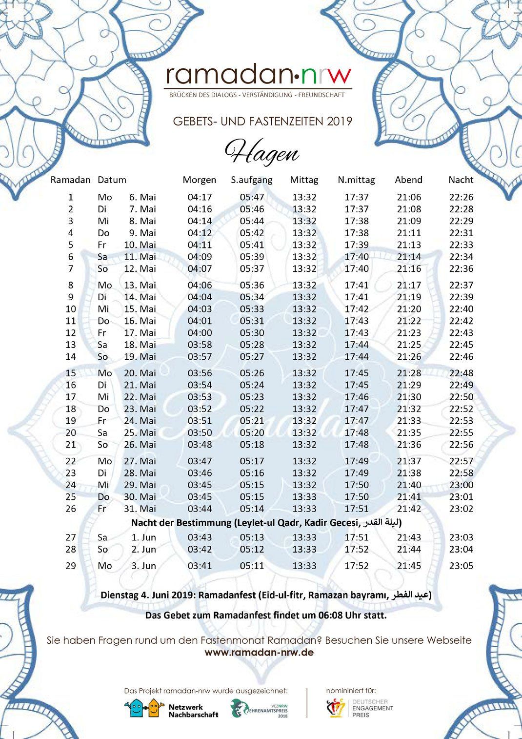 Hier finden Sie den Ramadankalender 2019 mit den Gebetszeiten für Hagen und Umgebung. Gefastet wird ab Morgendämmerung bis zum Abend. Am Abend findet dann das Fastenbrechen statt.